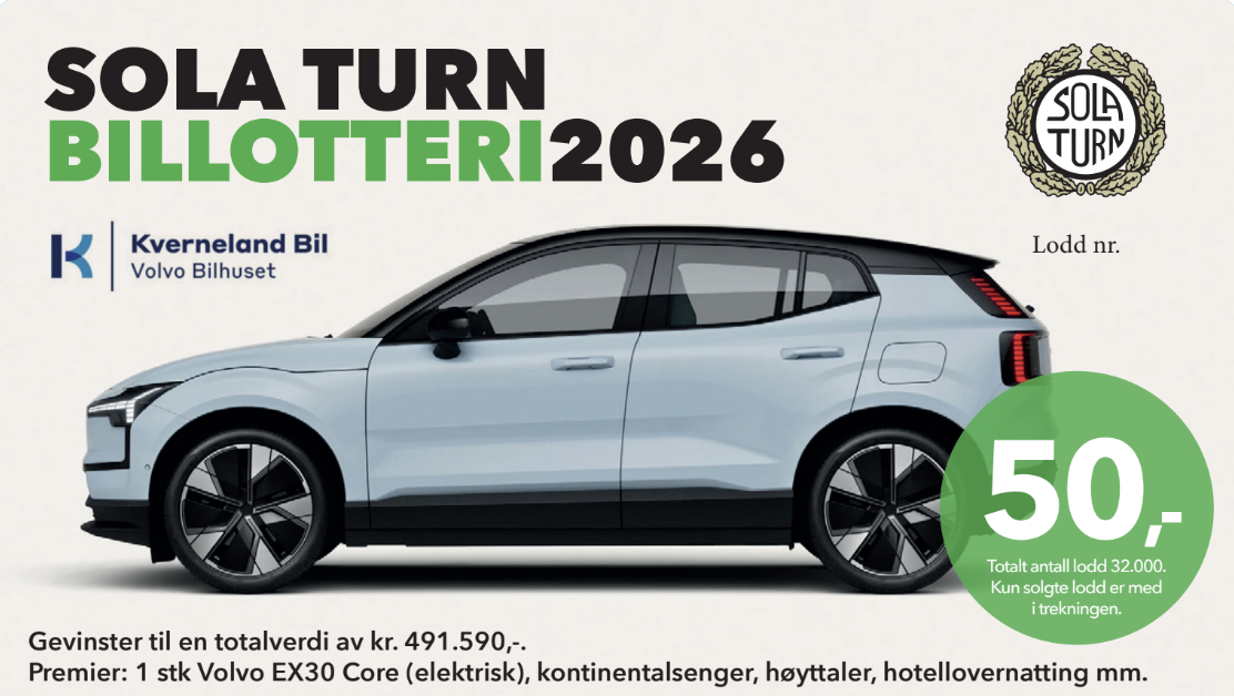 For fjerde gang arrangerer Sola Turn et stort lotteri, og denne gangen kan du vinne en godt utstyrt Volvo EX30 (extended range plus RWD). I tillegg har vi mange flotte premier, blant annet: