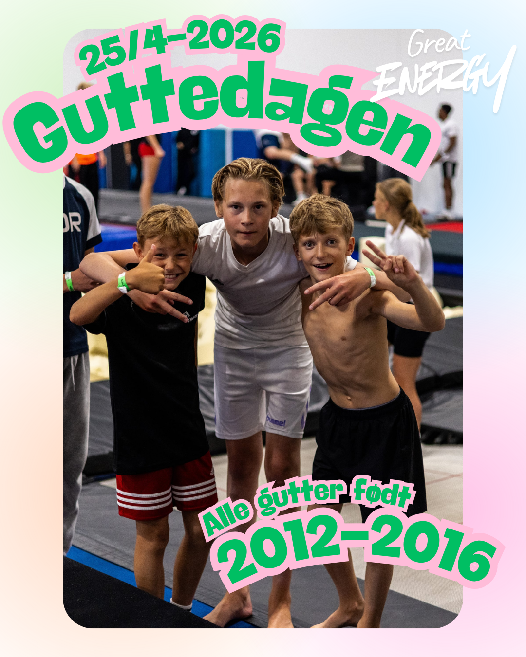 Bli med på en rå Guttedag lørdag 25.04 kl. 12:00–20:00! Dette er for alle gutter født 2012–2016. Det blir en actionfylt dag med stortrampoliner, airtrack, backflips, challenges, pizza, film og mye mer gøy. Her blir det skikkelig «guttastemning» fra start til slutt – vi gleder oss til en dag full av energi, mestring og latter!